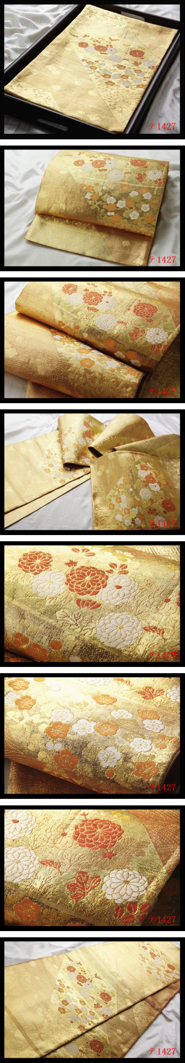 - 蔵【テ1427】西陣逸品 振袖可 菊梅紋 金色地 気品豊かに 正絹純金糸六通高級美術袋帯 ◇検◇簪着物名古屋帯和装小物帯締め