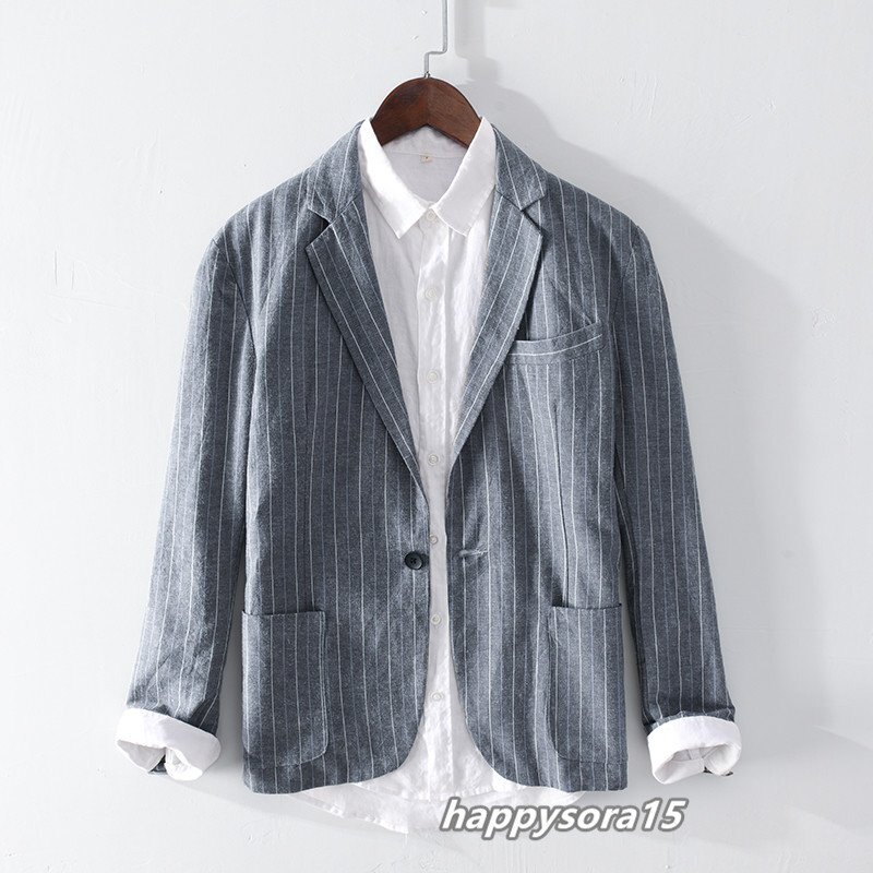 > テーラードジャケット メンズ リネンジャケット ブレザー ストライプ柄 サマージャケット 春秋物 アウター グレー 2XL