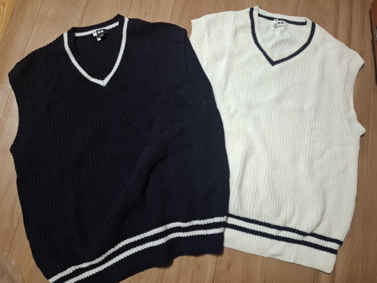 - ユニクロ 綿 アクリル Vネック ベスト Sサイズ 2枚セット 黒 白 UNIQLO *白に染みあり