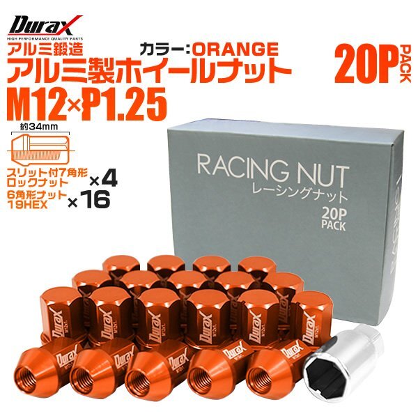 > Durax レーシングナット ラグナット ホイール M12 P1.25 アルミロックナット 袋 34mm 橙 20個 アルミ ホイールナット日産 スバル スズキ