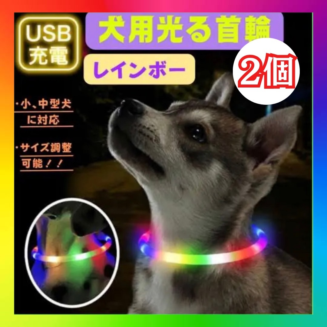 - 首輪 犬 光る レインボー 2個 おしゃれ 散歩 LEDライト USB充電 安全