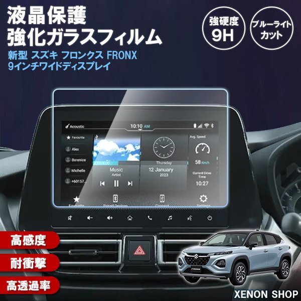 - [1020]フロンクス FRONX 新型 スズキ 9H ガラスフィルム 9インチ カーナビ 強化 液晶保護 硬度9H 指紋 飛散 防止 ブルーライト 強化ガラス