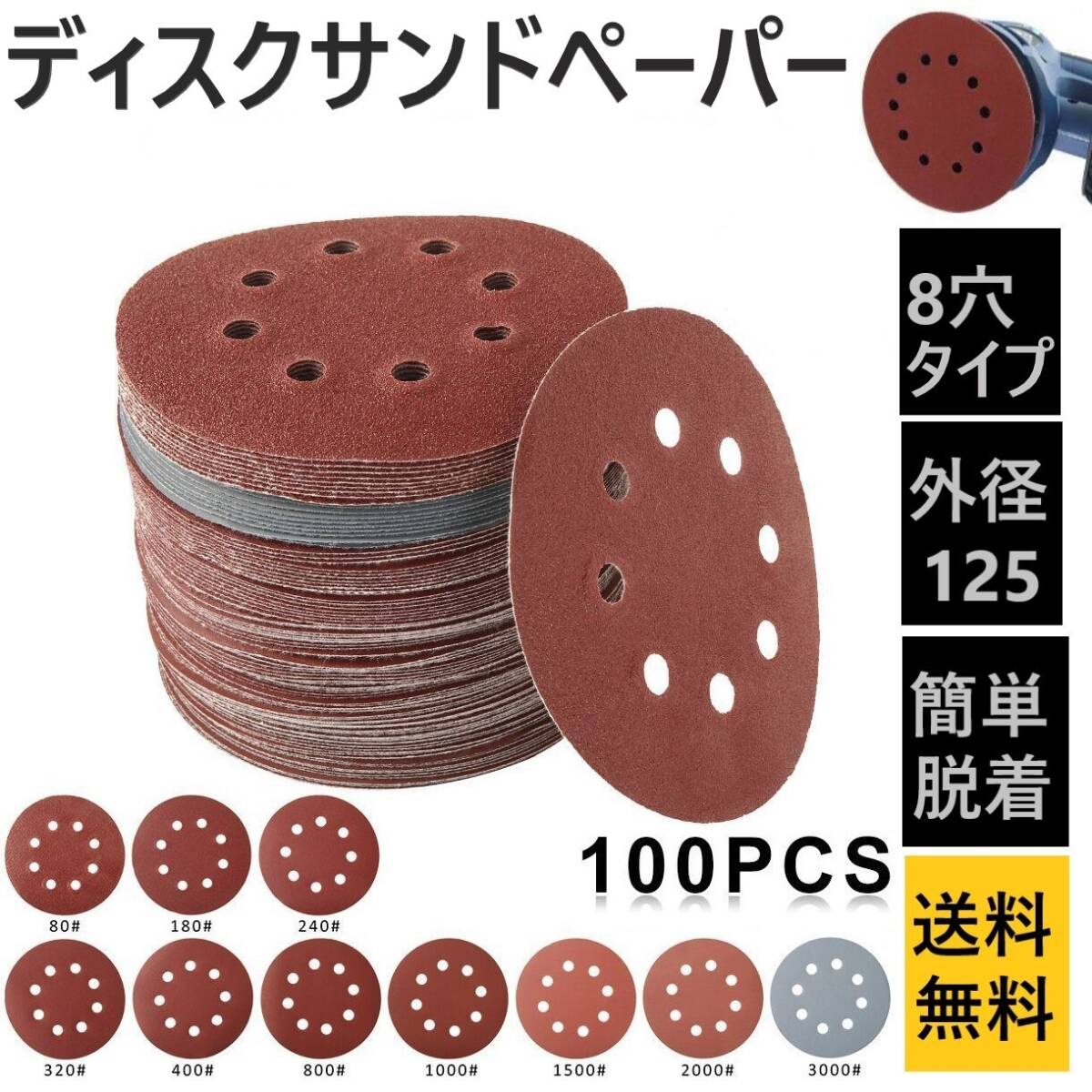 - ディスク サンド ペーパー ランダムサンダー 紙やすり 研磨 研削 加工 10種100枚 マジックテープ脱着式 グラインダー DIY 集塵 8穴 D125mm