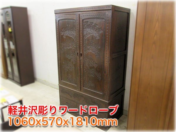 > 軽井沢彫りワードローブ 1060x570x1810mm 桜柄 手彫り 鍵付 上段ハンガーポール・ネクタイ掛・ミラー/下段2段引出し【長野発】