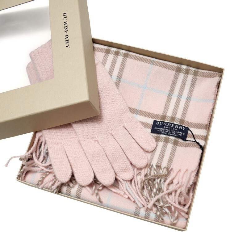 > MH9536*《2点セット》BURBERRY バーバリー カシミヤウール チェック柄 マフラー+ニットグローブ 手袋 ストール ピンク スコットランド製