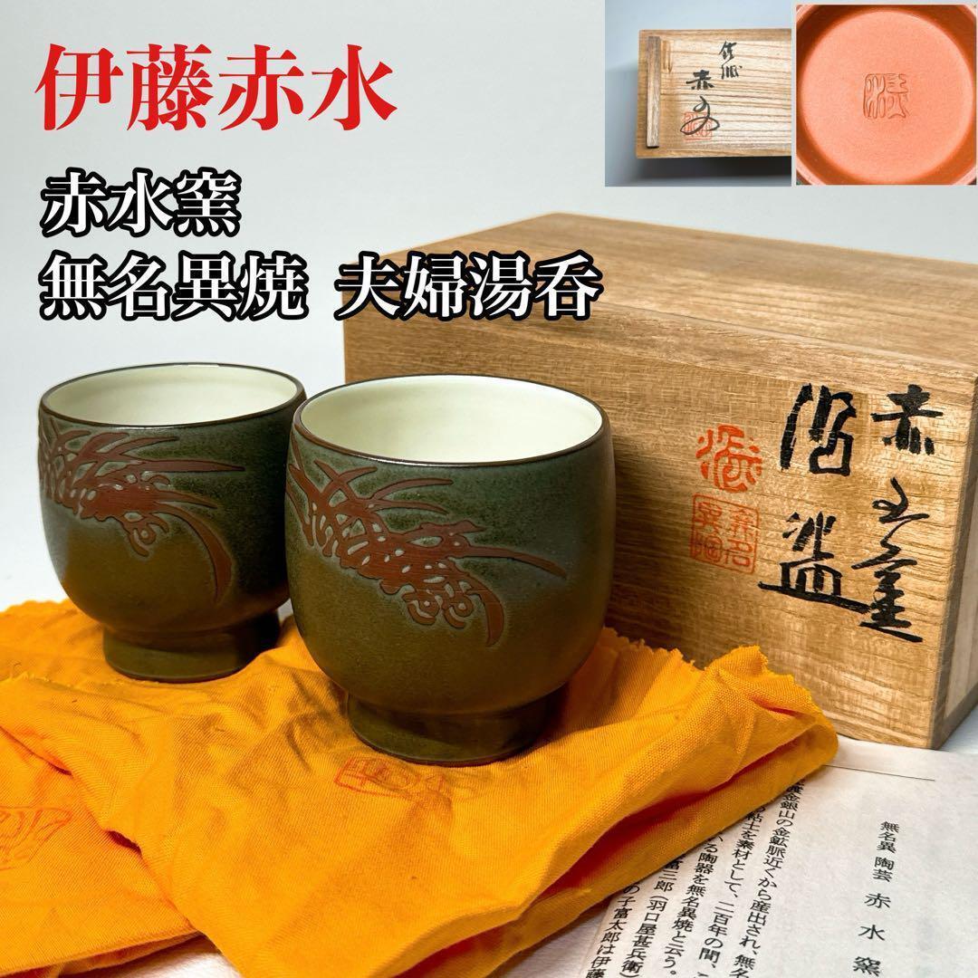 - 【共箱共布付】伊藤赤水 赤水窯 佐渡 無名異焼 朱泥 夫婦湯呑 一対 湯飲み 茶碗 茶器 人間国宝 茶道具 骨董