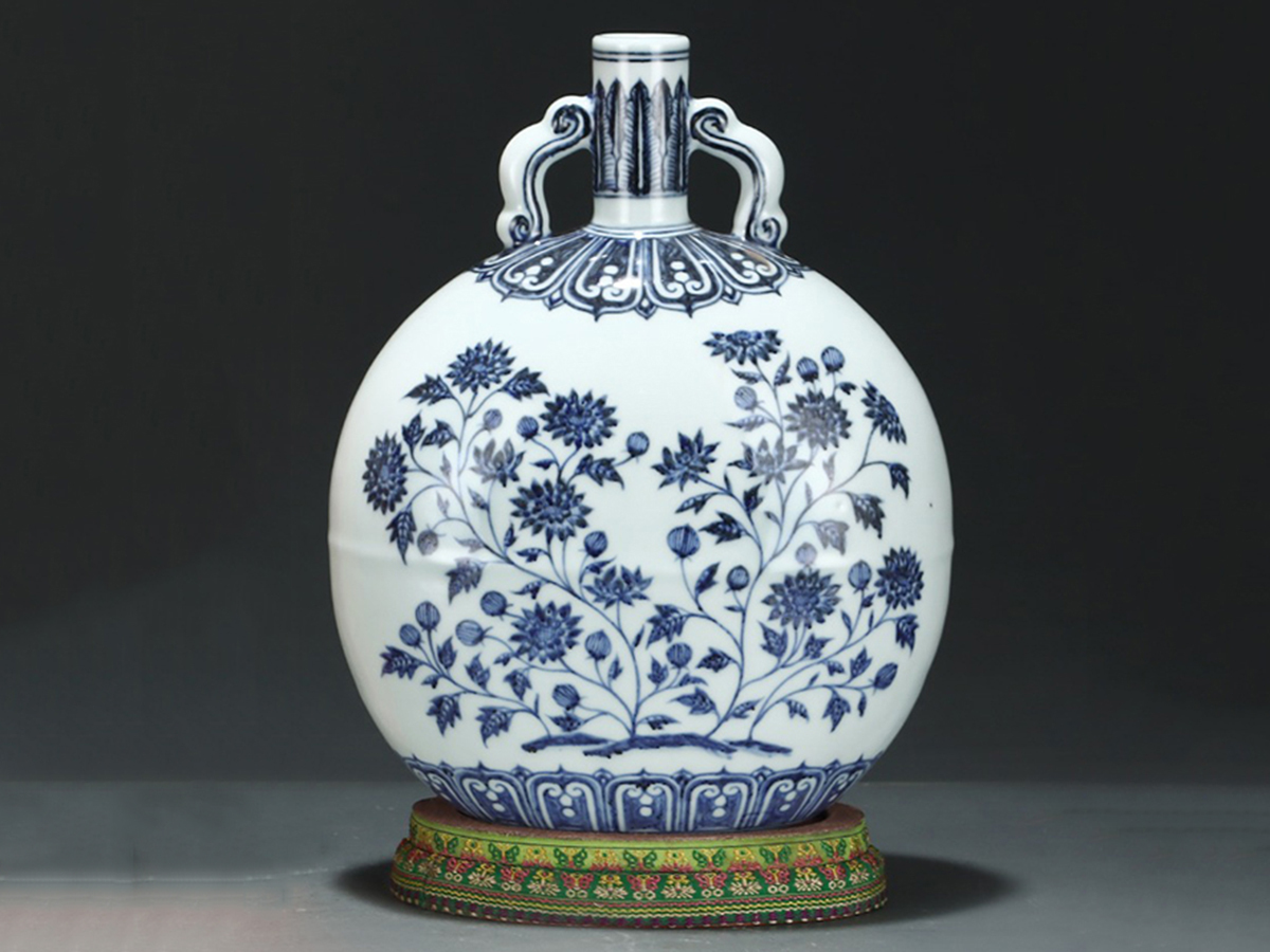 - ▽鴻▽明時代 陶磁器 青花花草紋如意耳抱月瓶 共箱 時代物 中国古美術 骨董品