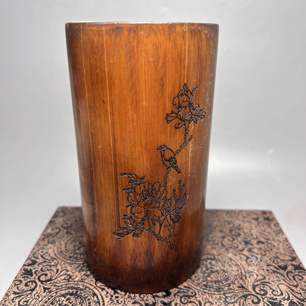 > 旧家蔵出し竹材細密彫 喜上眉梢紋 詩詞付 筆筒 筆立 文房具 書道品 文房賞物 極細工 置物擺件 美術品 旧家蔵出 旧家供養品