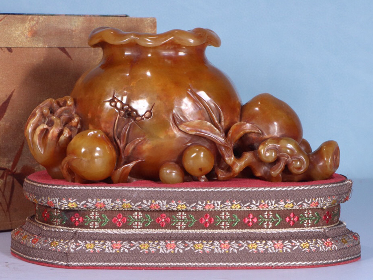 - ▽鴻▽清朝時代 寿山石 田黄石彫 三多紋水孟置物 元珠作 箱付 時代物 中国古美術 骨董品