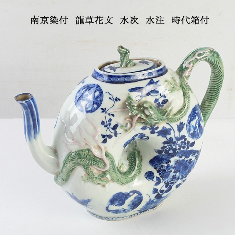 - 中国美術 南京染付 龍草花文 水次 水注 時代箱付 古玩 GFKY