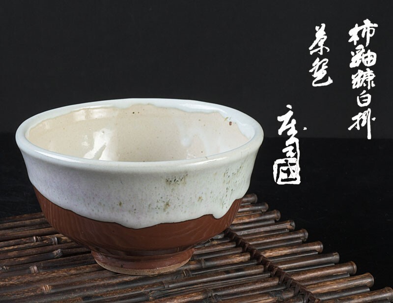 - 人間国宝 濱田庄司作 柿釉糖白掛茶碗 仕覆付 共布共箱 VCRH