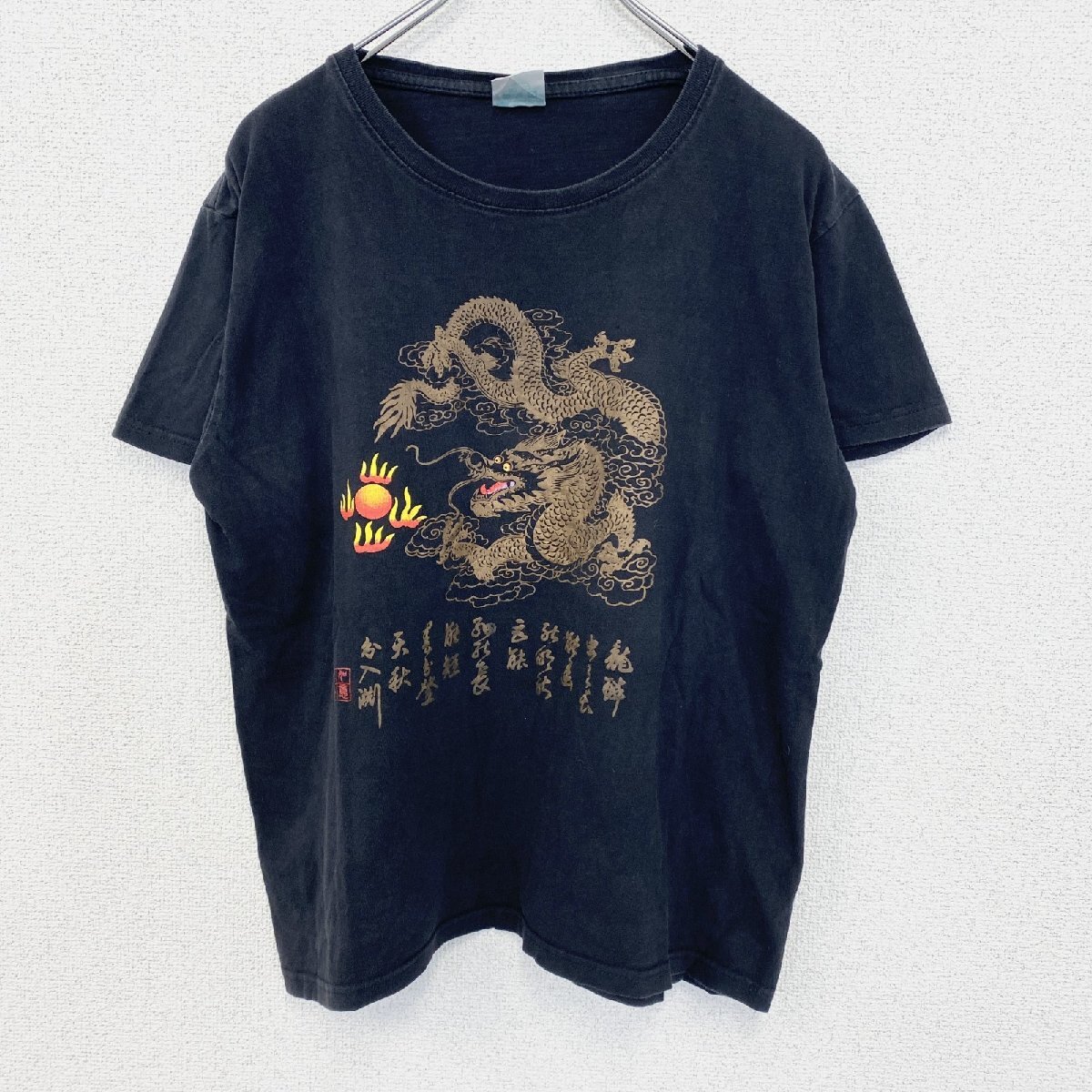 - 古着 used ノーブランド 半袖プリントTシャツ 龍 ドラゴン 漢字 和デザイン クルーネック 黒 レトロ 春夏服 Lサイズ