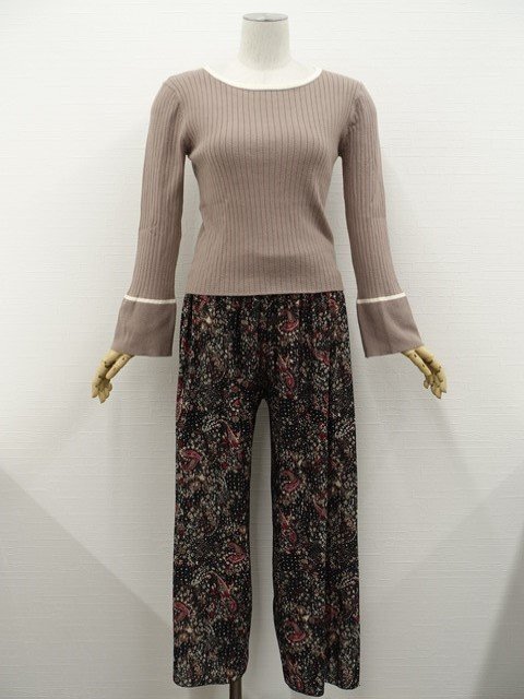 > 美品 Linoluce等 長袖カットソー+ワイドパンツ コーディネート2点セット M相当 グレージュ/ブラック地 総柄 フェミニン系 30代~40代