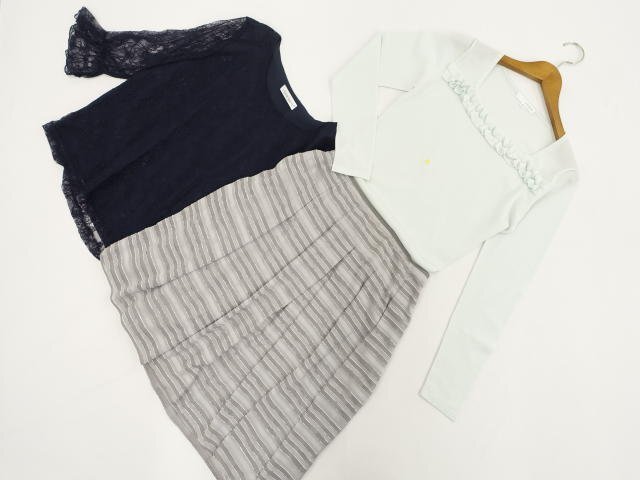 > 美品 any FAM等 POブラウス+カットソー+膝丈スカート コーデ3点セット L相当 紺 花/緑/グレー系 ボーダー きれいめ・オフィス系 20代~30代