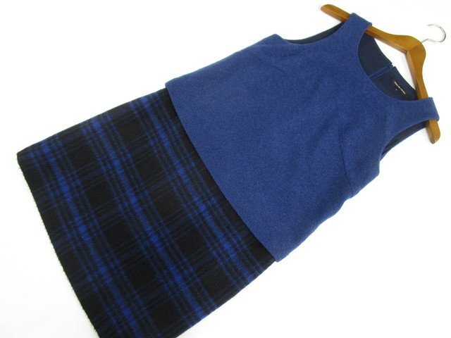 - 美品 クイーンズコート QUEENS COURT ひざ丈 ノースリーブ ドッキングワンピース 1 ブルー/ブルー×ブラック タータンチェック柄
