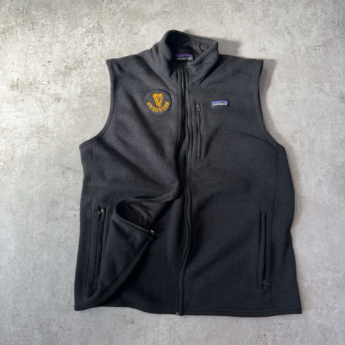 > Patagonia パタゴニア フリースベスト ブラック スリランカ製 古着 企業ロゴ隠しワッペン貼り付け ゆったり メンズ 正規品