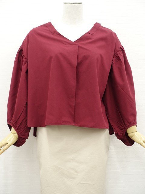 > 美品 continuer de NICE CLAUP ドロップショルダー&パフスリーブ 長袖 Vネック 洗えるプルオーバーブラウス F ボルドー 【メール便可】