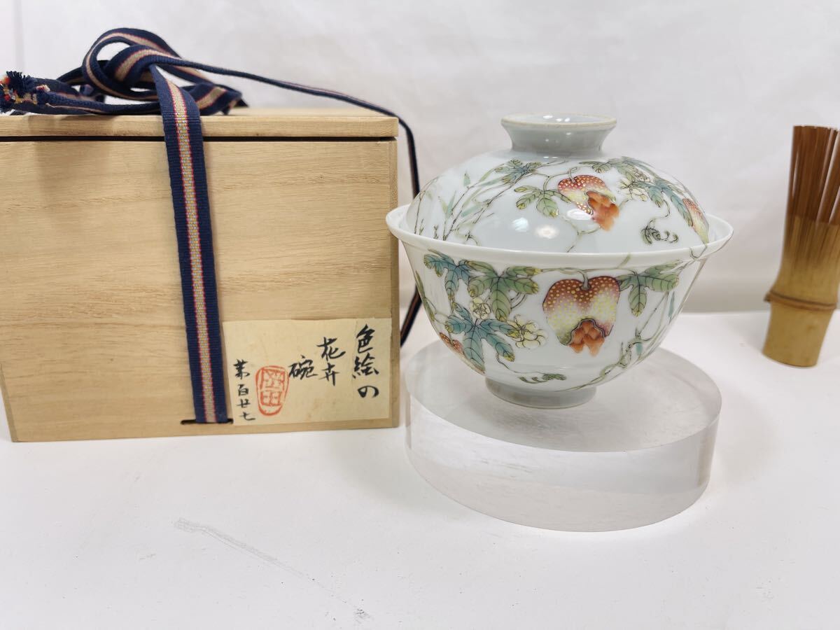 - 【B217】色絵 瓜果紋 蓋碗 「大清嘉慶年製」在銘 共箱付 細密細絵 蓋碗 お碗 茶碗 茶盞 小鉢 茶器 茶道具 賞物 置物 時代物 中国古美術