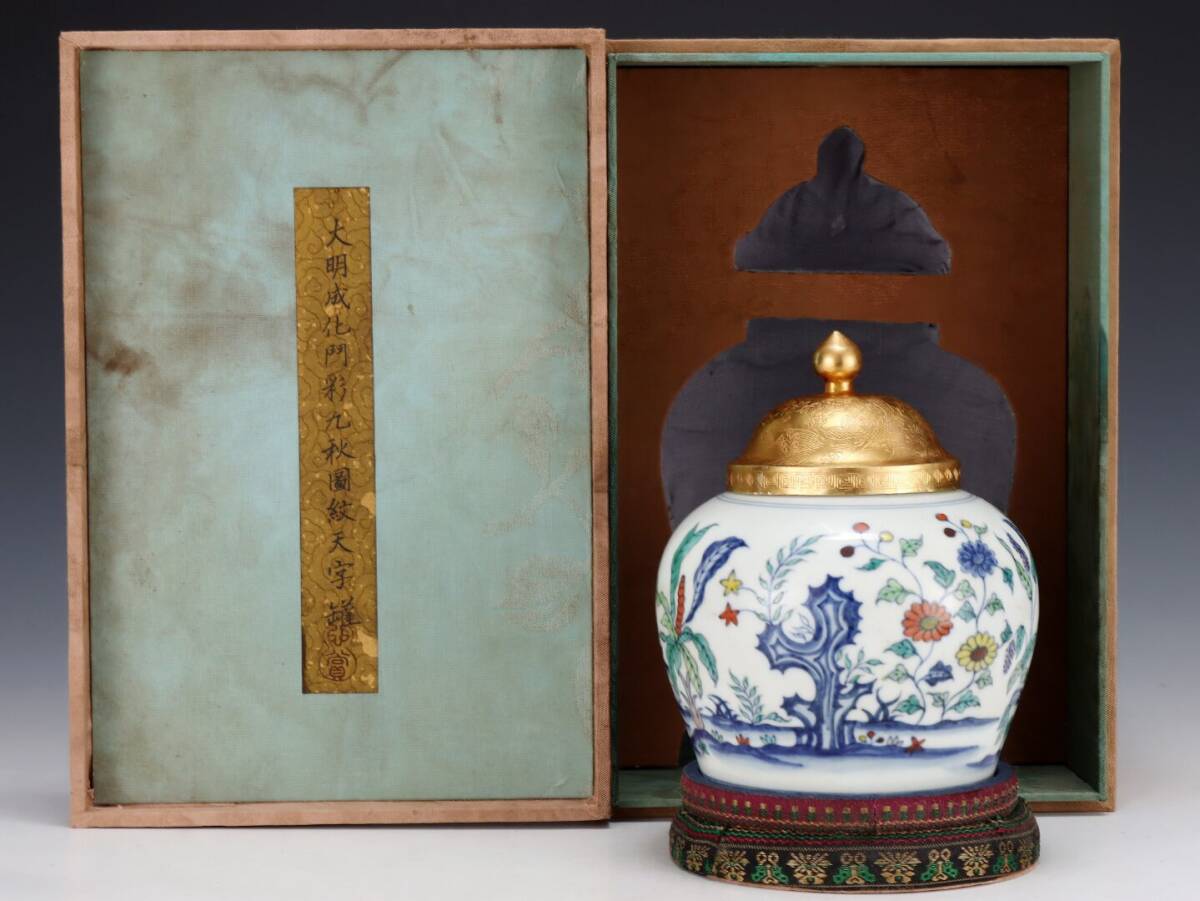 - ▽鴻▽明朝時代 陶磁器 成化年製 斗彩九秋図天字罐 銅金蓋 時代木箱付き 染付 時代物 中国古美術 骨董品