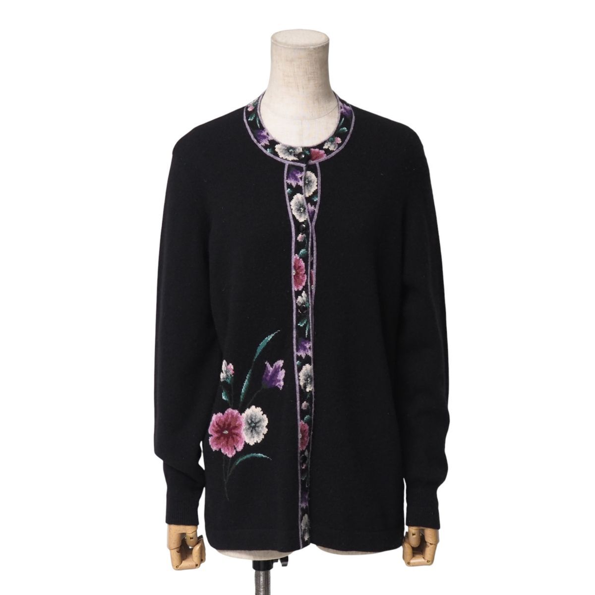 - TJ5324▲Refined 総カシミヤ ラメ/花柄 クルーネック ニットカーディガン ミドル丈 サイズL相当 ブラック系