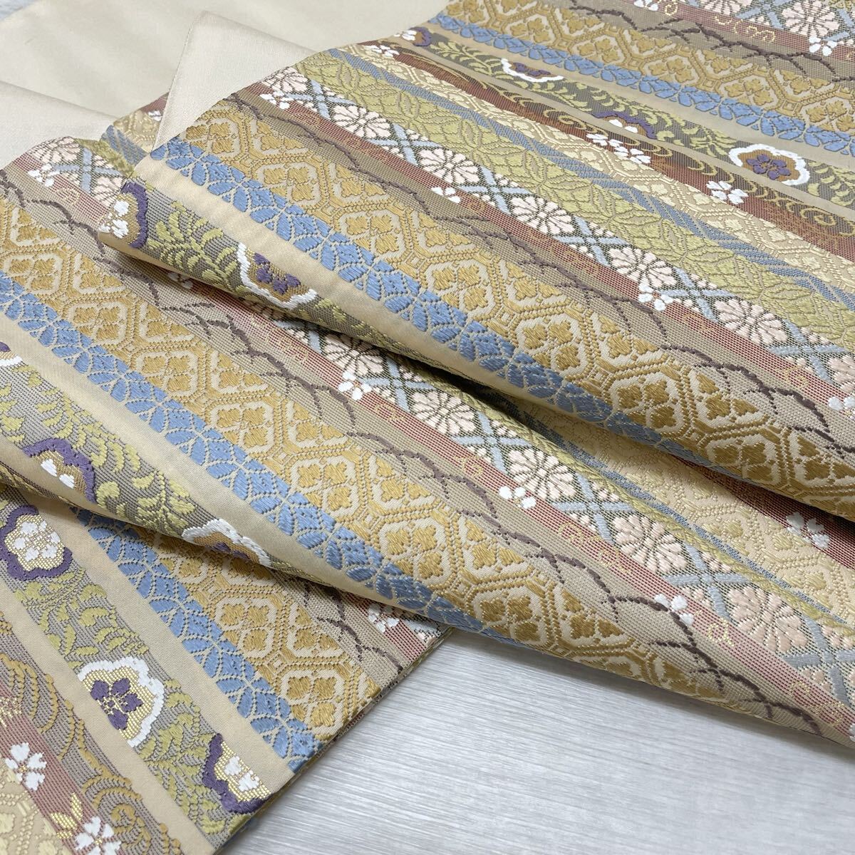 > 袋帯 唐織 横段に花模様 細かな織 正絹 着物 W-4952