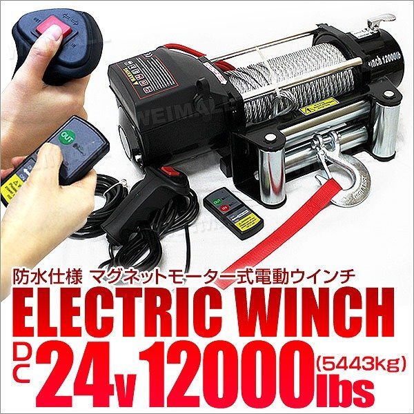 - 電動ウインチ DC24V 最大牽引 12000LBS 5444kg 無線リモコン付属 電動 ウインチ 引き上げ機 車両 ボート 牽引 防水仕様 ホイスト クレーン