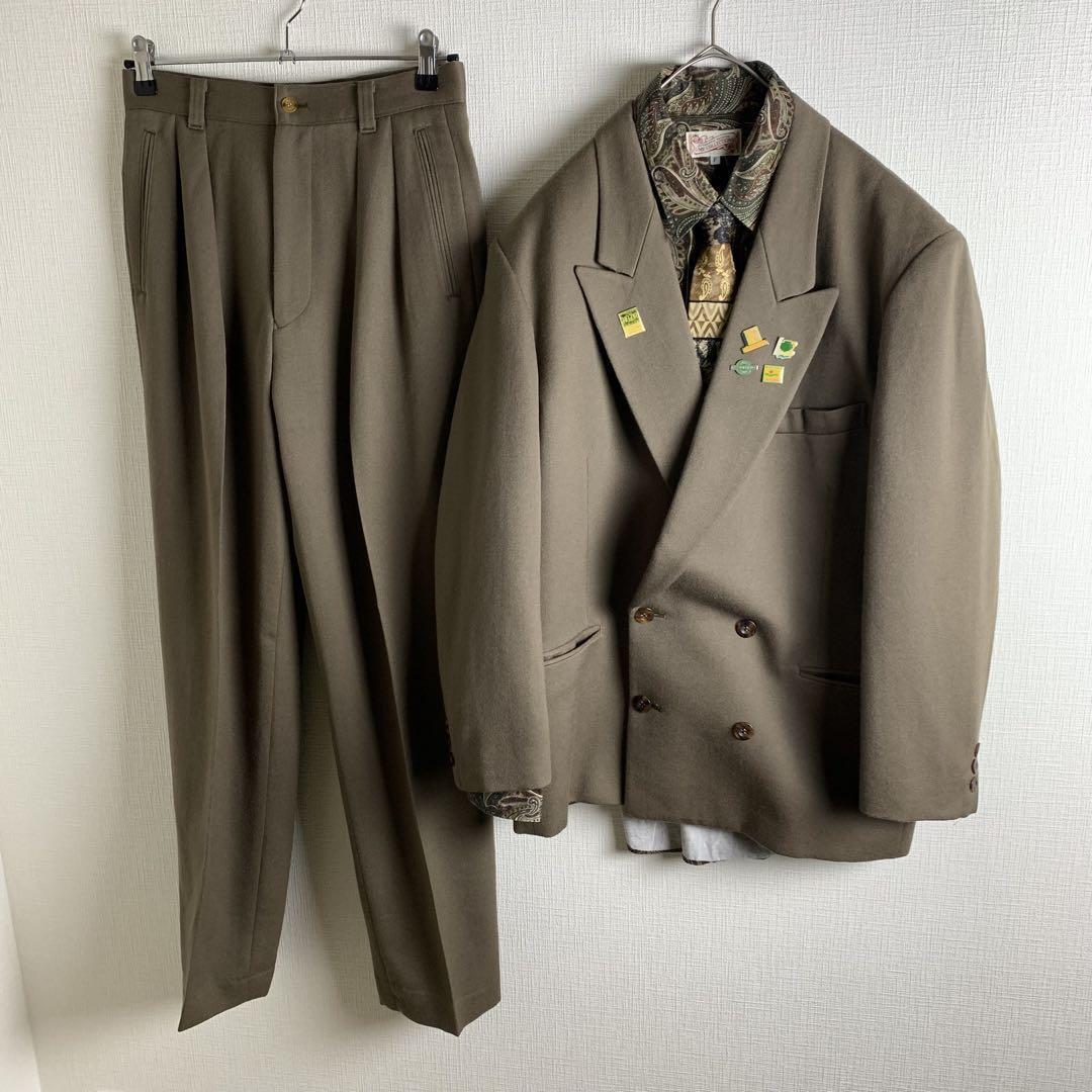 > コーデ売り セットアップ カーキブラウン 希少カラー スーツ 長袖シャツ ネクタイ 総柄 カジュアル メンズ セレモニー 結婚式 古着