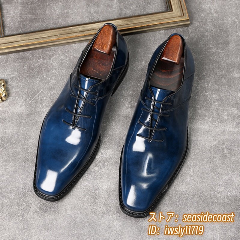 > 最高級◆定価11万 ビジネスシューズ チェック柄 本革 レザーシューズ 超希少 職人手作り 手塗仕上げ 上質牛革 紳士靴 革靴 ブルー 25.0cm