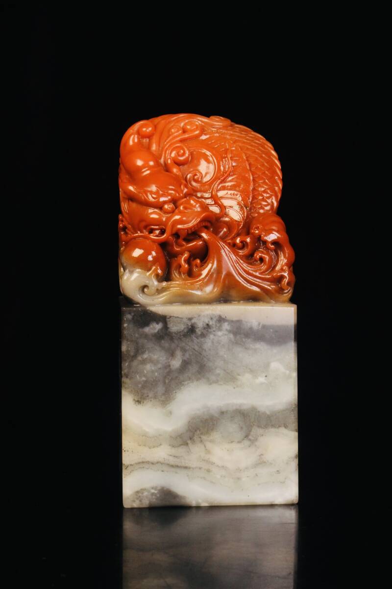 > ◆珍蔵◆中国古美術 清時代 古寿山石彫り巧色火龍珠印章 精品 箱付 細密細工造 置物 擺件 古賞物 骨董品 時代物 A68