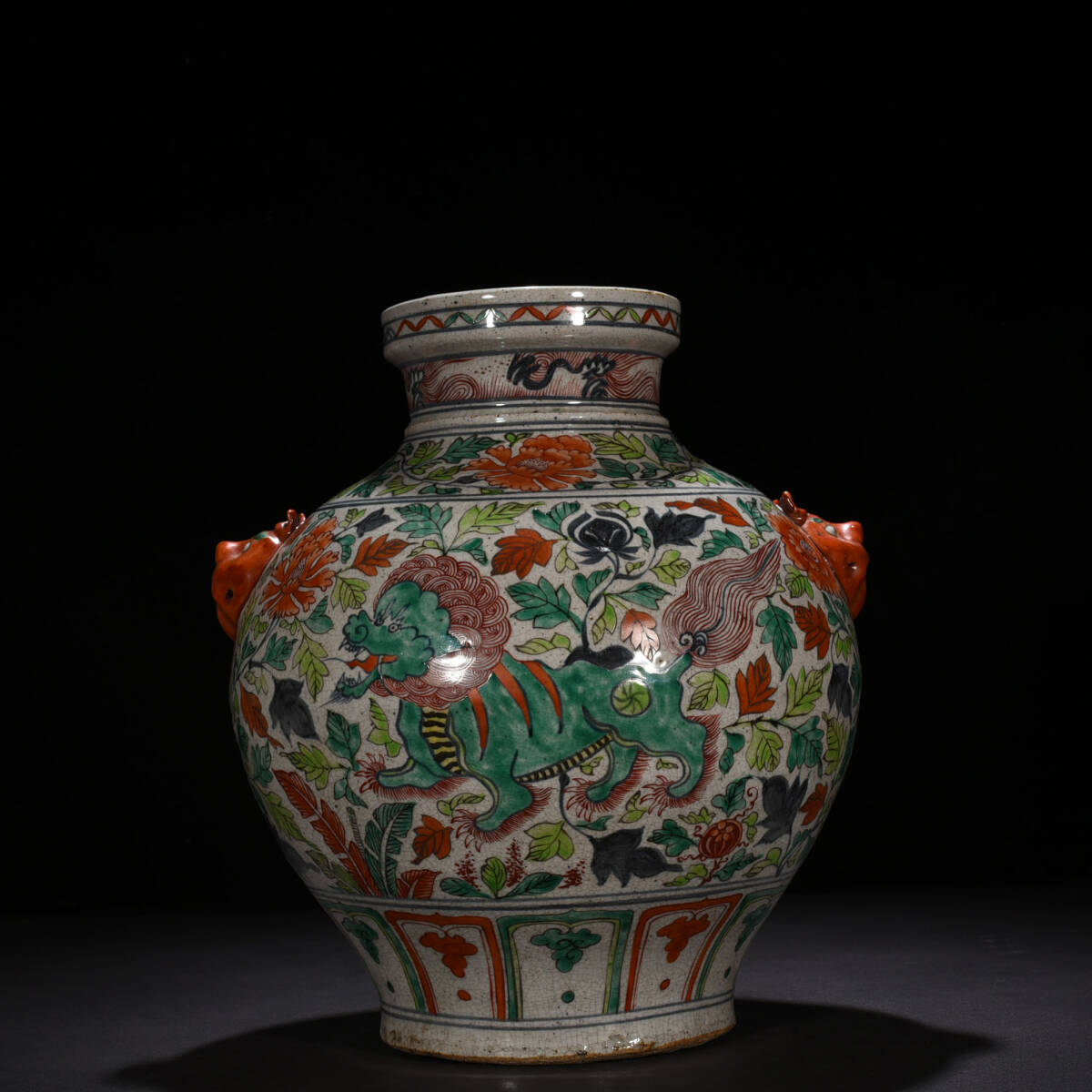 - ◆珍蔵◆中国古美術 元代 五彩 古陶磁 纏枝蓮花 獅子図獸耳罐 細密細工造 置物 擺件 古賞物 骨董品 時代物 A33