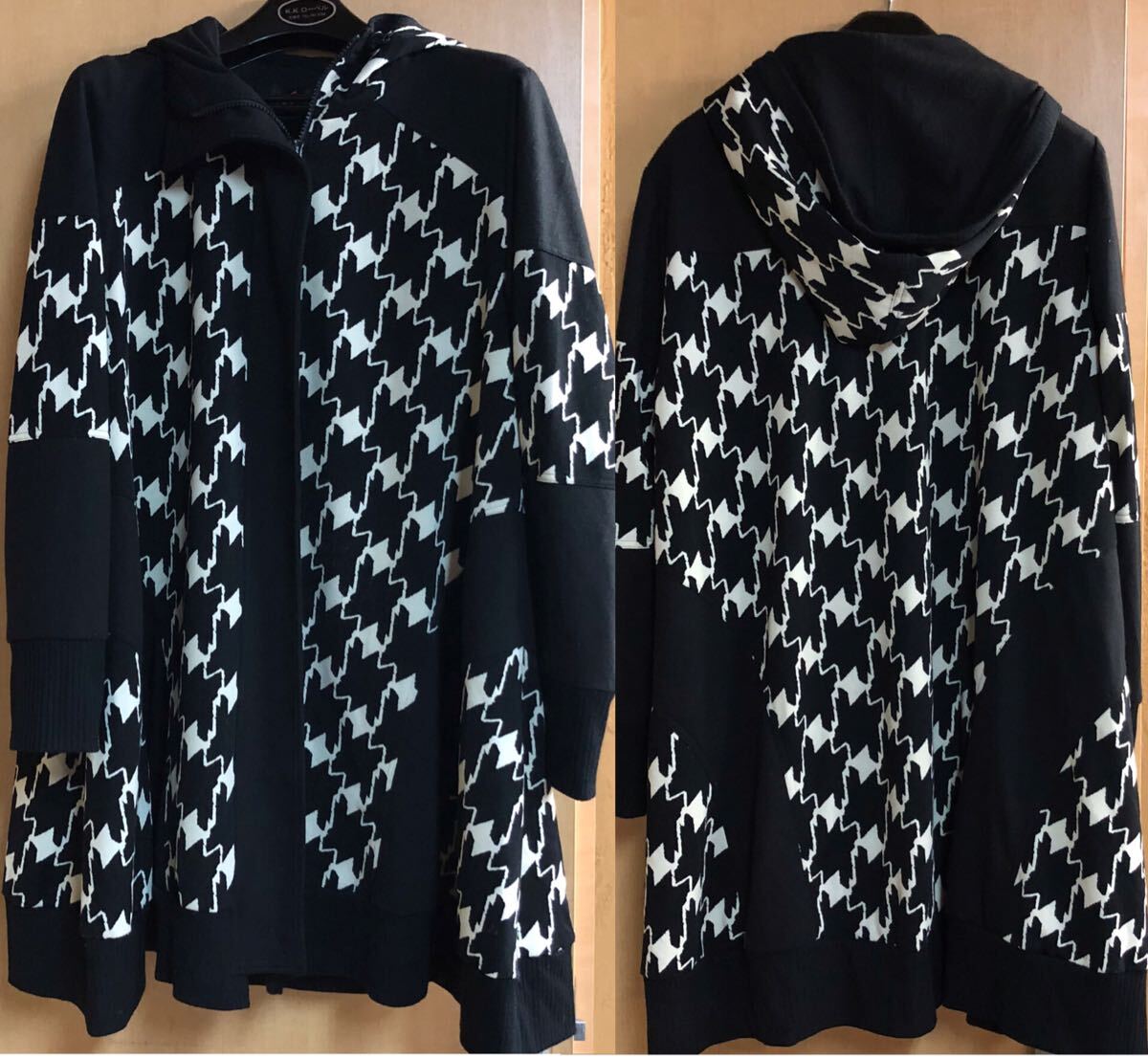 - ☆タグ付き ジャケット トップス 羽織 長袖 ジップアップ サイズ42 13〜15号位 メンズ レディース ブラック×ホワイト 柄物 春秋 フード付
