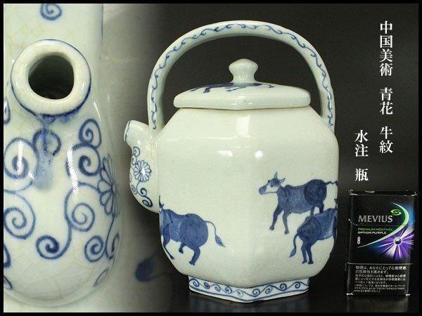> 【銀閣】中国美術 青花 牛紋 水注 瓶 高23.5cm 旧家蔵出 送料無料(YB675)