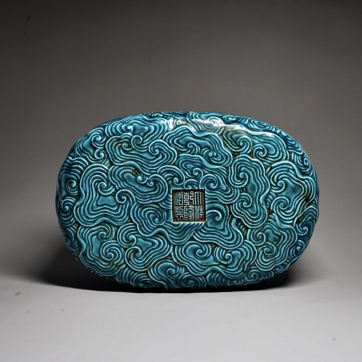 - 雲文彫刻唐物 時代物 乾隆年製 天藍釉 極細工 文鎮 紙鎮 腕枕 腕鎮 清時代 文房具 古美術 骨董 置物