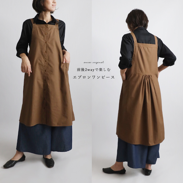 - 最終SALE ベビーキャンバスコットン 前後2wayで楽しむ エプロン ワンピース ジャンスカ ゆったり キャメル H76