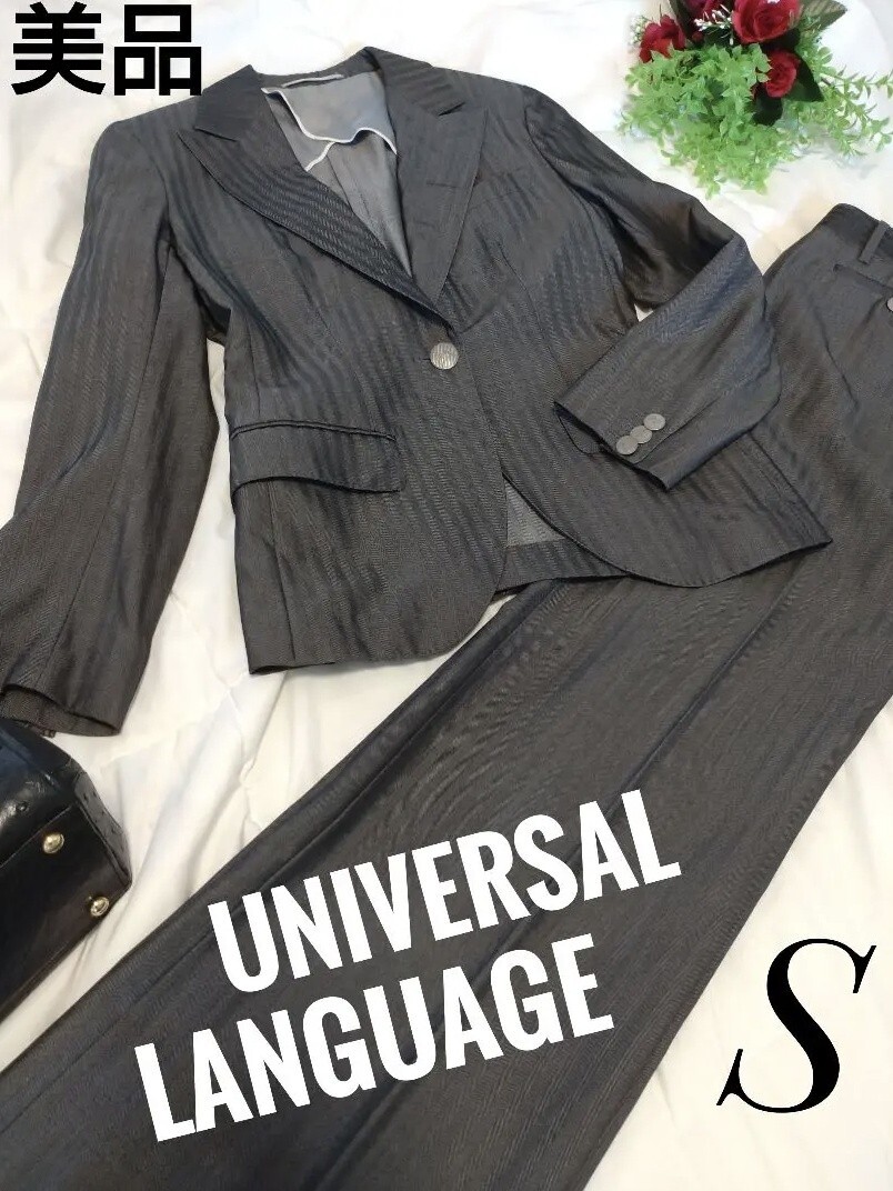 - UNIVERSAL LANGUAGE ユニバーサルランゲージ セットアップスーツ グレー ジャケット九分袖程 ストライプ シルク17%入 パンツスーツ
