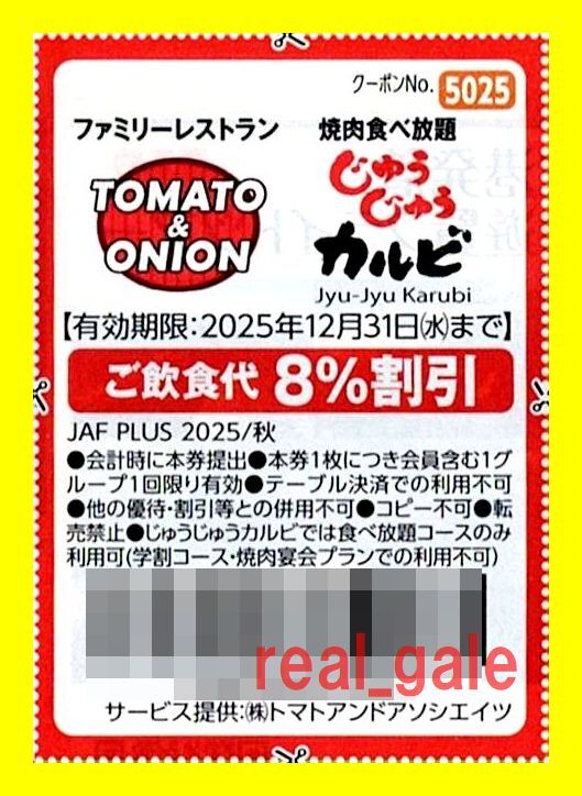 - ■■送料無料■■トマトアンドオニオン/じゅうじゅうカルビ 8%割引券■2025年12月31日まで■