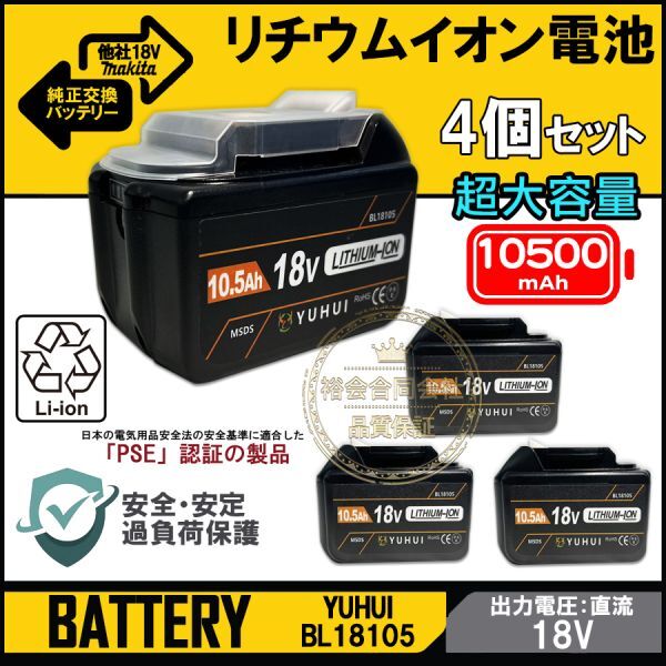 > ★送料無料・30日間保証付き★4個セット最強マキタ18Vバッテリー 10500mAh 全工具対応 大容量BL18105×2 BL1890/BL1860/BL1830/BL1850互換