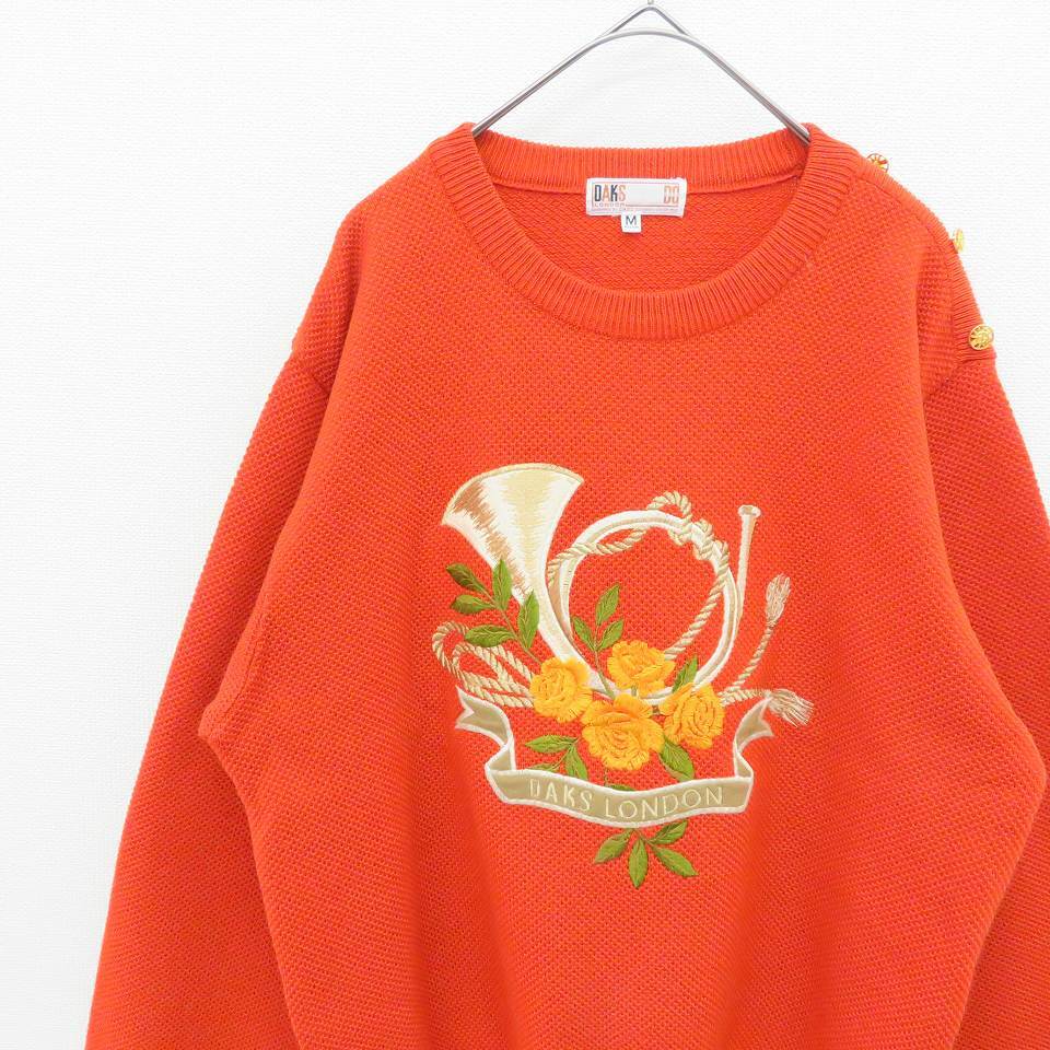 【ブランド】ダックスDAKS【アイテム】ニットセーター【表記サイズ】M【平置き実寸】肩幅: 43cm袖丈: 54cm着丈: 54cm身幅: 51cm【状態】目立った傷汚れなし【備考】-【色】レンガ色系【素材】画像をご参照ください★当店の商品はすべてリユースアイテムとなります。特質上、些細なダメージは記載しておりませんので着用に問題のない使用感、着古した雰囲気などはご了承くださいませ。キーワード/アクイール/古着/used/ビンテージ/ヴィンテージ/レトロ/昭和/ダックスロンドン/DAKSLONDON/クルーネック/金釦