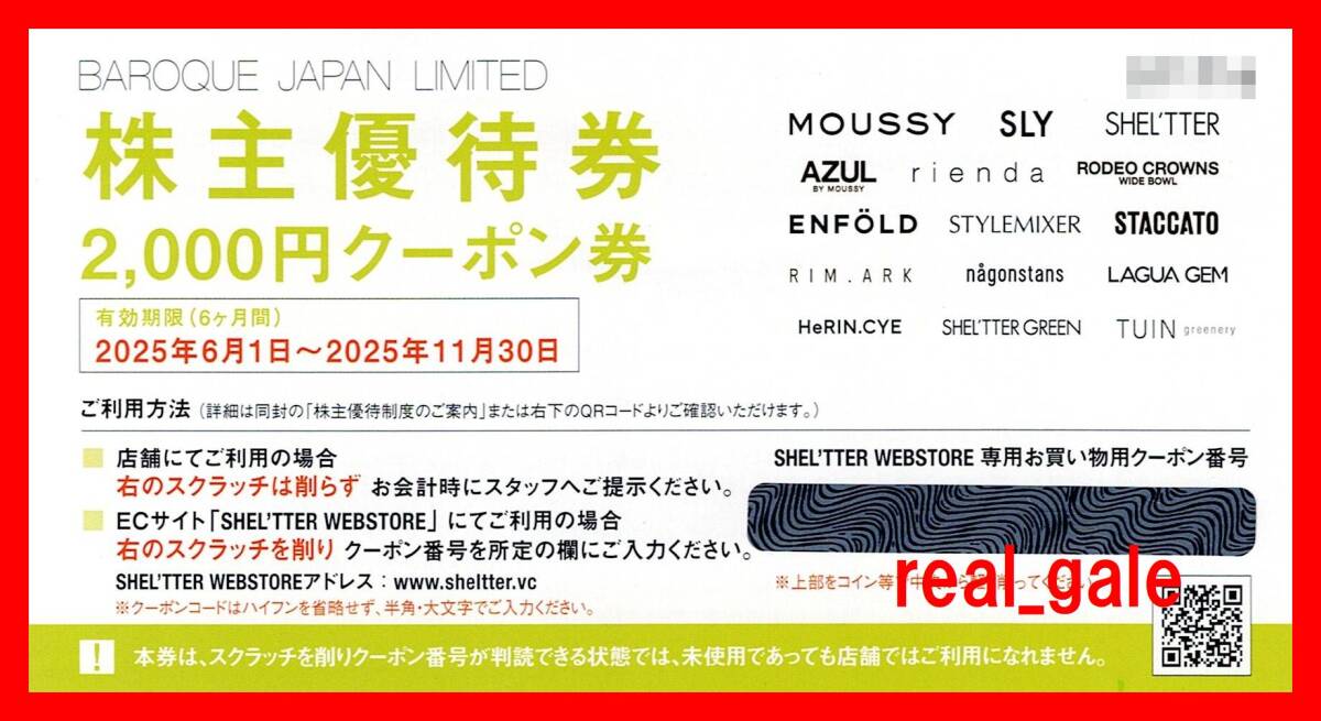 > ■■送料無料■■バロックジャパンリミテッド 株主優待 2000円券■MOUSSY/AZUL/SHEL'TTER■実店舗利用可能■2025年11月30日迄■2枚出品■