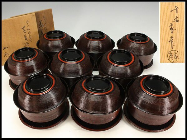 - 【金閣】石州好 独楽塗 蕎麦椀 九客 受皿 九客 平安象彦製 共箱 旧家蔵出 送料無料(A750)