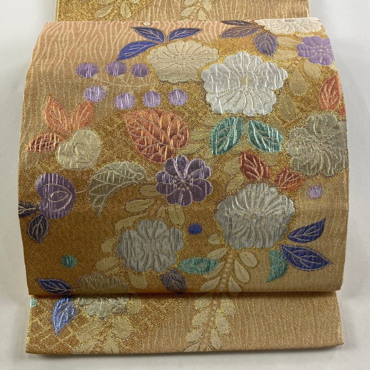 - 【美品】 袋帯 秀品 草花 箔 薄オレンジ 六通 正絹 【中古】