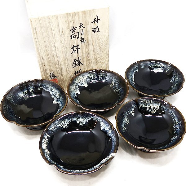 - DKG★送料無料★ 未使用 丹波焼 昇陽窯 『 大上裕 』 天目釉 高杯鉢揃 5客 共箱付き 天目釉高杯鉢 高杯 鉢