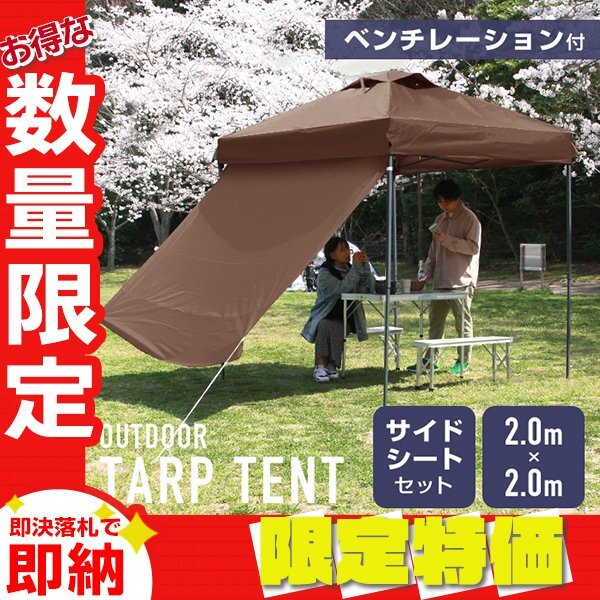 > 【限定セール】サイドシート付 タープテント 2m ベンチレーション 収納ケース 撥水 スチールフレーム UVカット アウトドア BBQ ブラウン