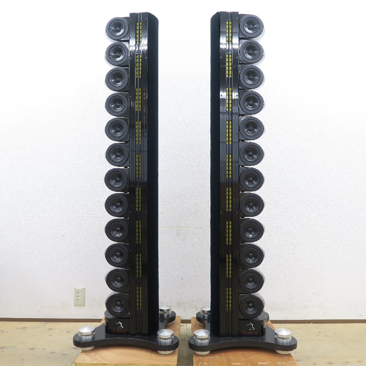 メーカー型番:Scaena model3状態ランク:現状動作:確認済み付属品:無し元箱:無し整備歴:不明オーナー歴:不明当社保証:無しメーカー保証:無しその他:本来はサブウーファーとセットの販売のようですが、こちらのスピーカーにサブウーファーは付属しません。そのため、別途サブウーファーが必要になります。エッジが変形しているユニットが2箇所ありますが、音出しに問題はありませんでした。打痕により白くなっている箇所や塗装ハゲが複数、ベースの大理石にカケが複数あります。最下部のネットワークBOXは結線で繋がっているだけで、スピーカーに固定はされていません。ユニット固定・緩衝用のクッションボールが外れやすくなっており、輸送中に外れてしまう可能性がありますが、各ユニットの高さ調整をすることで元に戻すことは可能です。※保証無し現状販売です。※商品到着直後の初期不良のみ対応します。※上記説明は販売時に確認した状態です。説明と異なる場合でも現状優先です。※購入後「説明と違う」という理由で保証を求められても一切対応しません。Scaena model3 実測寸法外形寸法ベース部 幅500mm 奥行470mmスピーカー部 幅260mm 奥行300mm高さ 1600mm重量 約90.0kg/台※掲載している実測値は万全を保証するものではありません。正確な情報は各メーカーや代理店にご確認ください。保証のない商品について当商品の送料は配送先の環境により、別途追加料金が発生する場合がございます購入手続き画面からお客様情報入力後の自動送信メールとは別に、送料を含む合計金額の連絡を致します。連絡があるまで、お支払いはお待ちください