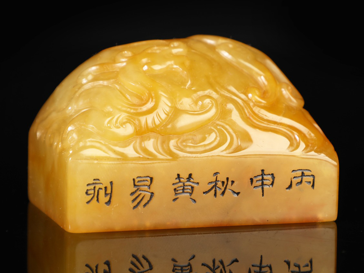 - ▽鴻▽清朝時代 寿山石 田黄石彫 魑龍紋印章 黄易作 箱付 時代物 中国古美術 骨董品