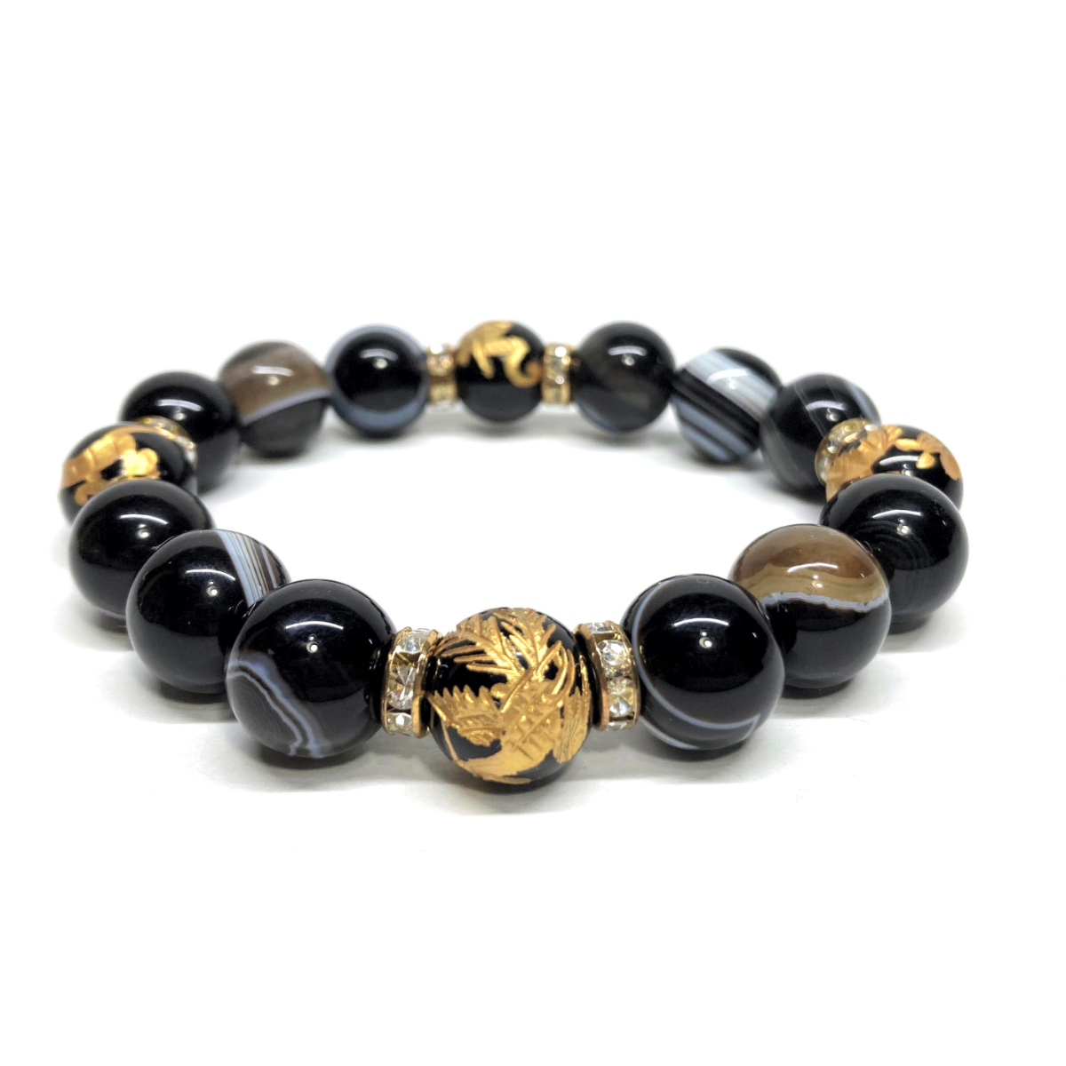 - 四神獣金彫オニキス×チベットアゲート(天眼石) 12mm パワーストーン ブレスレット天然石 青龍 白虎 玄武 朱雀 開運 金運 厄払 お守り G
