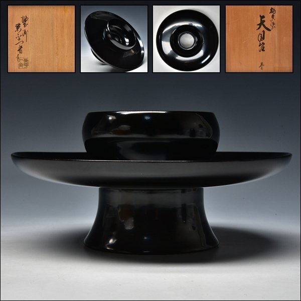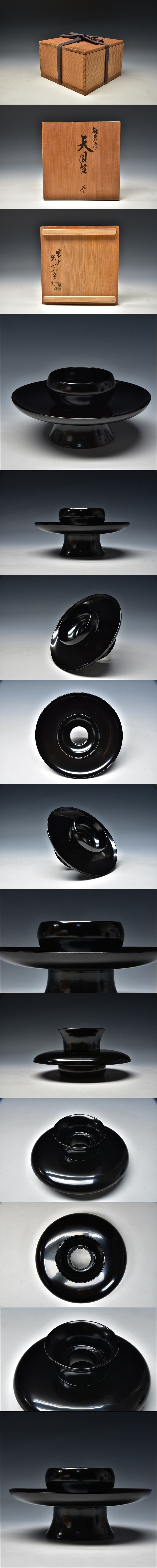 - U08934 輪島塗 塗師 茶平一斎 天然木 漆塗 黒漆 真塗 天目台 共箱