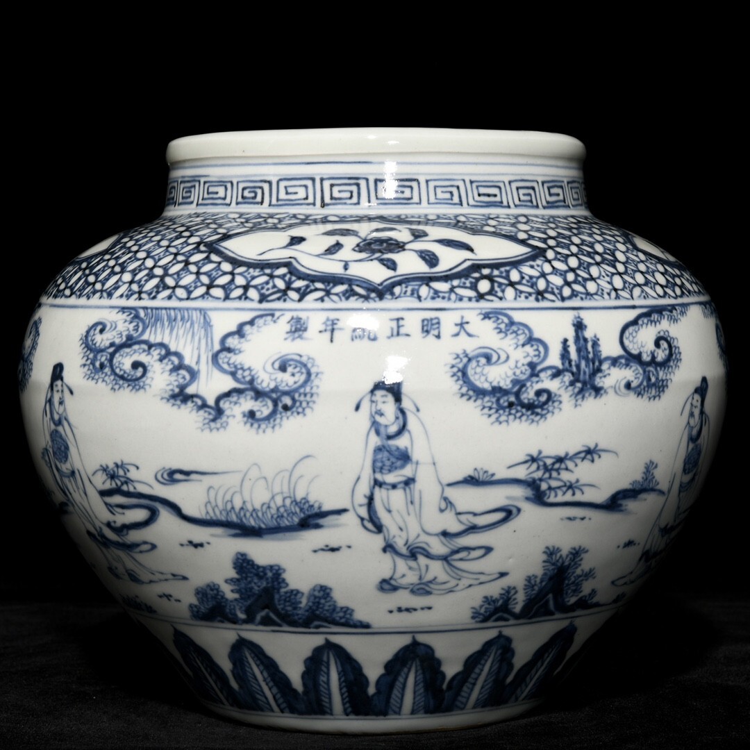 > 【永】明時代 大明正統年製 青花人物故事紋罐 古陶磁器 陶芸 皿 中国陶瓷器 唐瓷 置物擺件 古美術品 古賞物 収集 旧家蔵出 中国唐物 A92