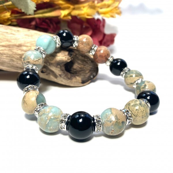 > インプレッションストーン&オニキス パワーストーン ブレスレット 天然石ブレス (シルバー) 12mm 幸運 開運 メンズ 男性♪