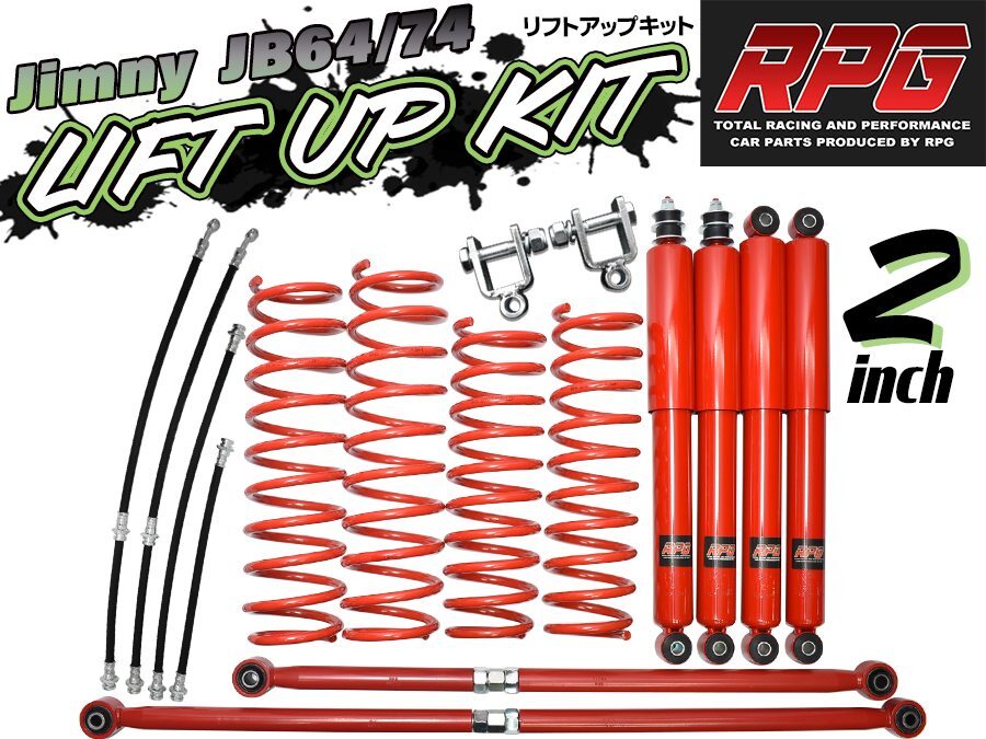 - ジムニー JB64W JB74W 2インチリフトアップキットRPGロングショック赤 ラテラル赤 コイル赤 ロングブレーキホース ブラケット